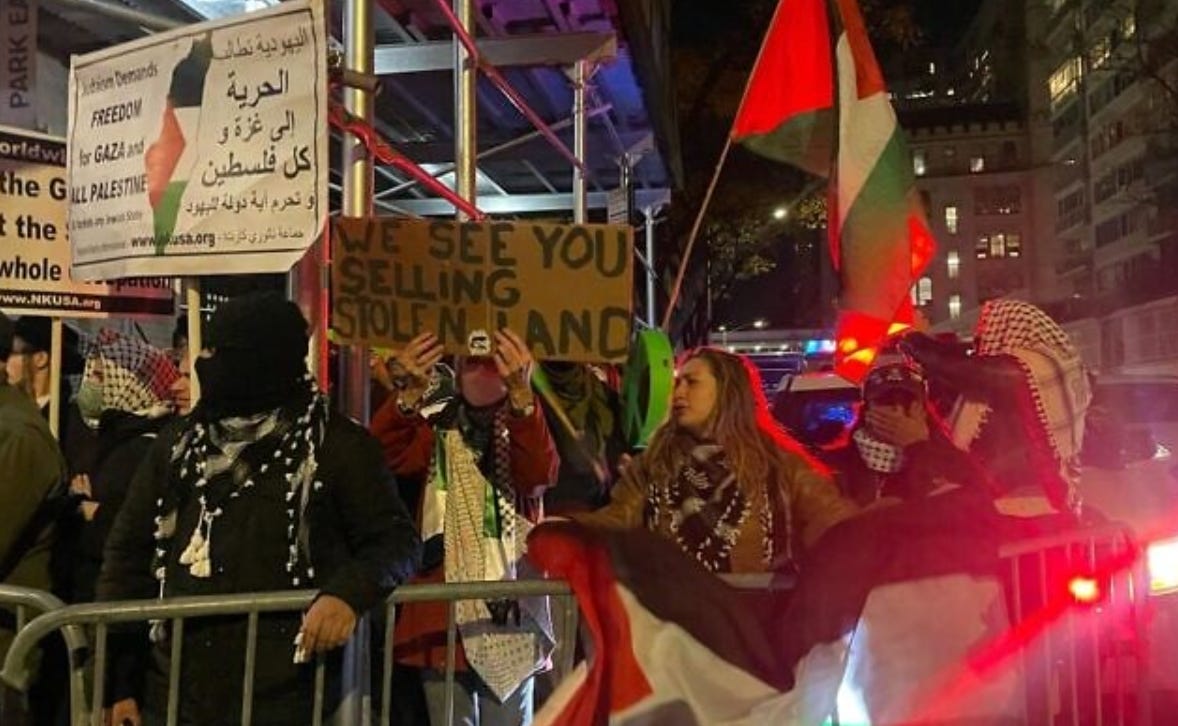 Antizionist mob at Park East Synagogue in New York City, November 19, 2025. (Luke Tress/Times of Israel)