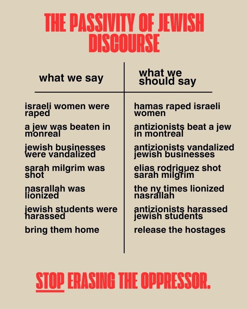 Contrast this with what Jews should say—language that restores agency to those who commit, legitimize, or amplify anti-Jewish harm: